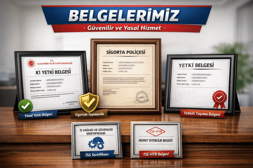 Taşımacılık hizmetlerimiz, ilgili kurumlar tarafından verilen yetki belgeleri kapsamında gerçekleştirilmektedir. Bu belgeler sayesinde evden eve nakliyat, şehir içi ve şehirler arası taşımacılık hizmetlerini yasal çerçevede sunmaktayız. Araç filomuz, gerekli ruhsat ve izinlere sahip olup düzenli olarak denetlenmekte ve bakımları yapılmaktadır.